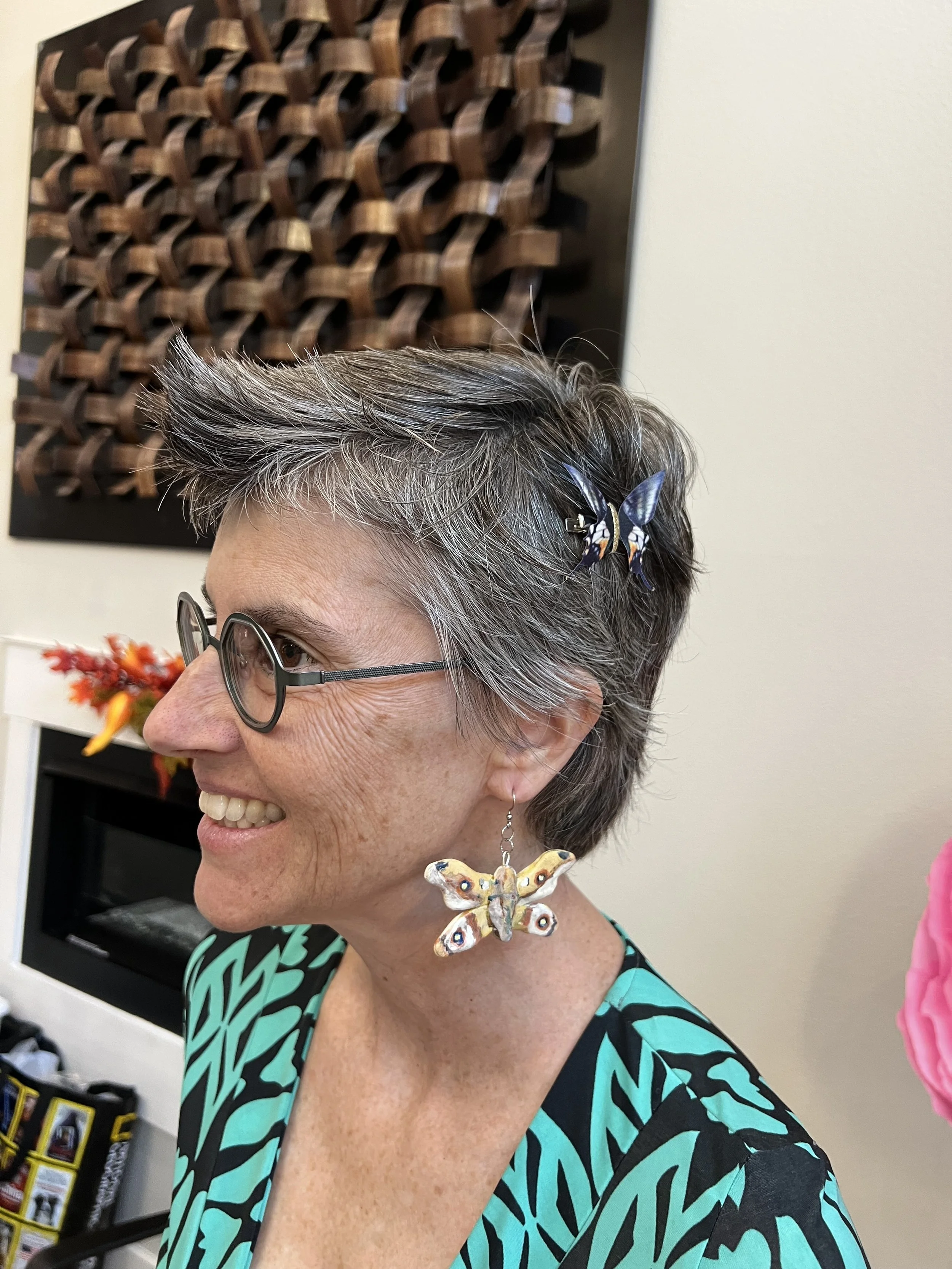 I got a bit busier with art league stuff as the person coordinating Art Education had to step aside for awhile due to health reasons so I am temporarily subbing for her. This mostly has involved helping to coordinate our Art Across the Ages program at a senior living community. This is why I was recently gluing an antennae back on to a ceramic butterfly haha which normally wouldn’t be in my wheelhouse. Anyway, I will be leading one of the workshops which will be Embroidery on Photography. Oh I did attend the Butterfly Gala fundraiser there and I was quite tickled that it was the perfect occasion to wear the earrings that Raine made for me.